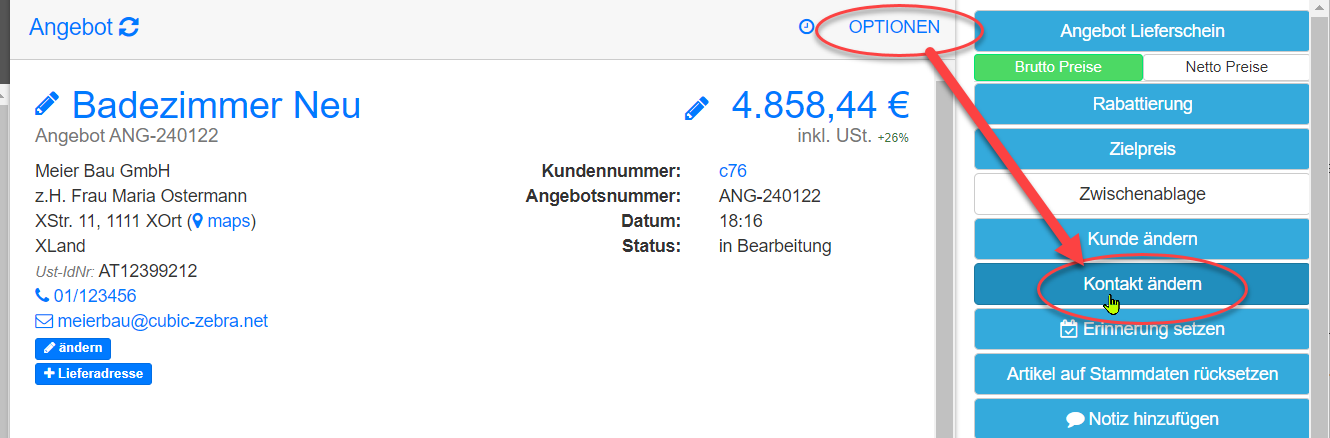 Alternativ dazu kann auch rechts oben unter “Optionen” –> “Kontakt ändern” der gewünschte Kontakt ausgewählt werden.