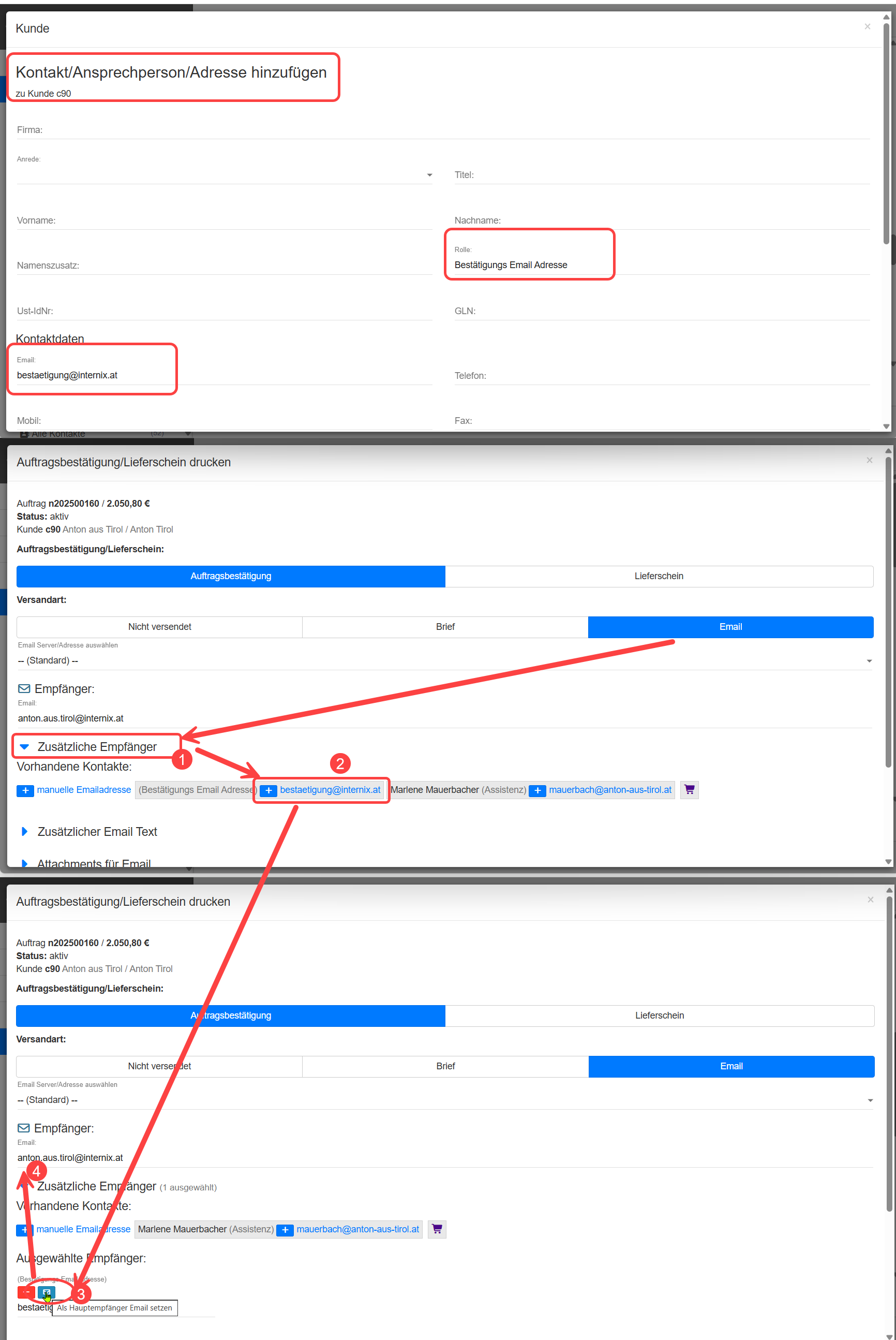 Eine Email Adresse eines Kontakts kann auch als zusätzlicher Empfänger oder als Hauptadresse beim Email Versand z.B. einer Rechnung oder eines Auftrags verwendet werden.